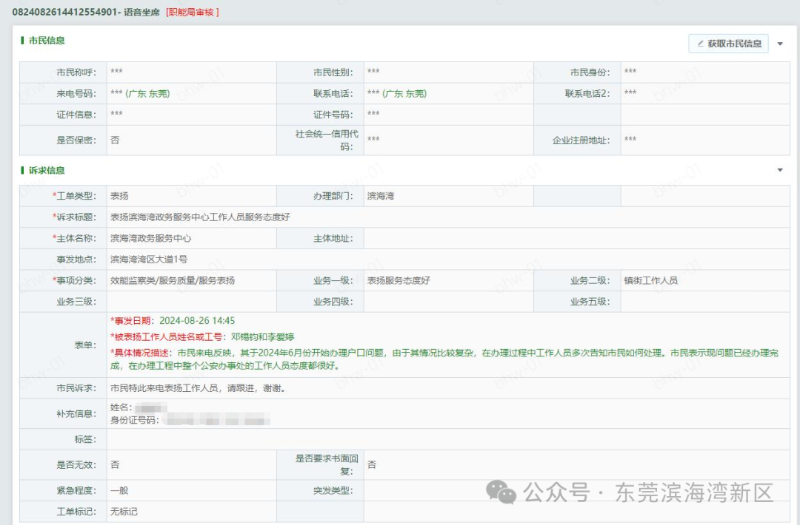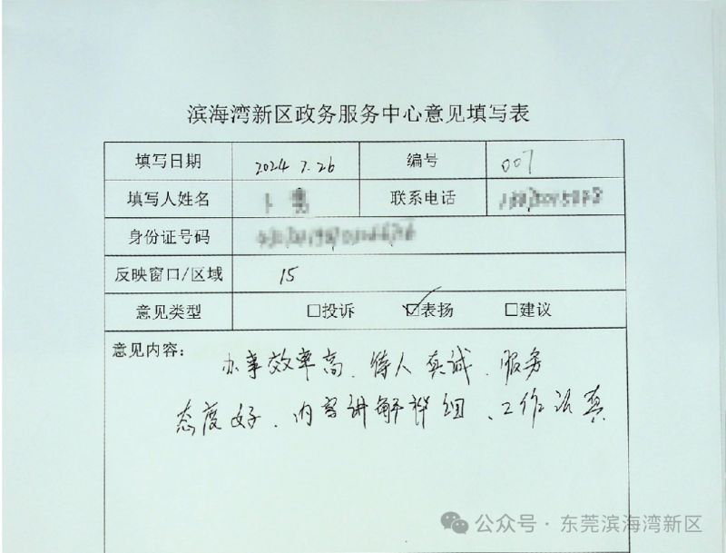 近日,唐小姐在滨海湾政务服务中心完成户口业务办理。事后,她特意致电东莞12345政务服务热线,对中心公安专区工作人员给予高度评价,重点表扬了“工作人员耐心周到、态度好,服务专业”,反复与审批部门进行沟通,为她及时解决户口问题。