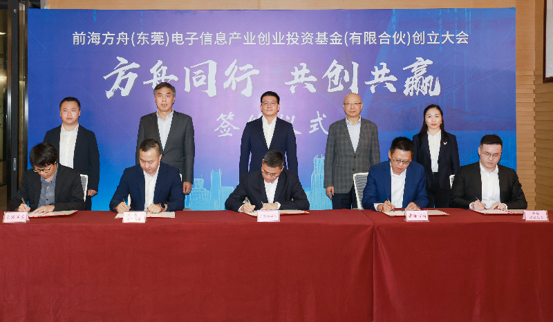 会上,滨海湾新区与东莞科创金、前海方舟、新疆胡杨母基金、梁溪产业签订协议,共同见证前海方舟(东莞)电子信息产业创业投资基金的创立。